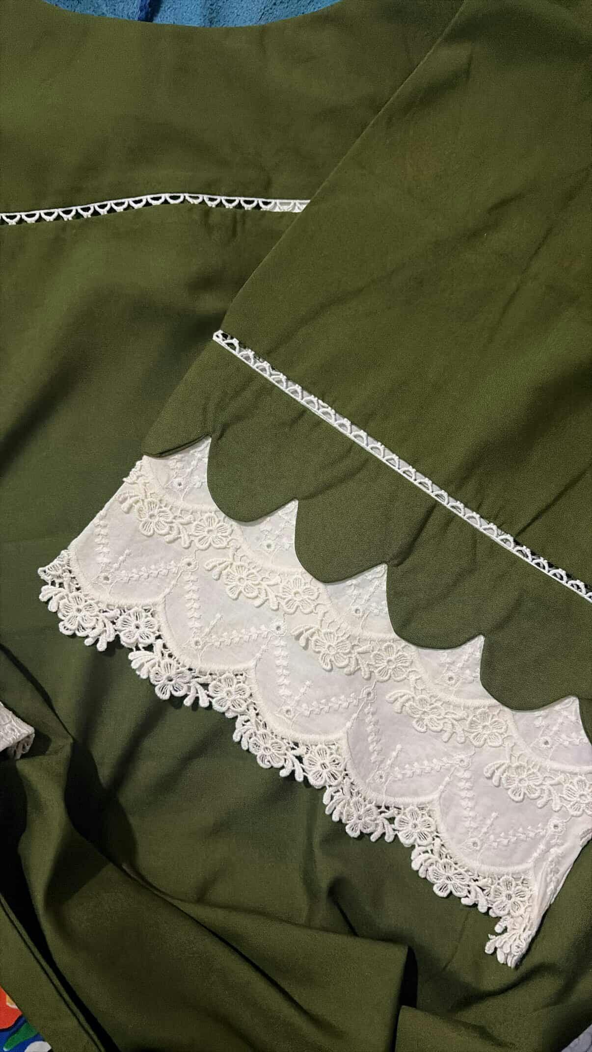 This elegant olive green kurti features a classic boat neckline and a modest, relaxed fit for all-day comfort. Designed with minimal detailing on the bodice, its true charm lies in the flared sleeves, beautifully finished with scalloped edges and intricate white lace accents. Perfect for work, casual outings, or semi-formal gatherings, this versatile piece blends understated style with timeless grace.
